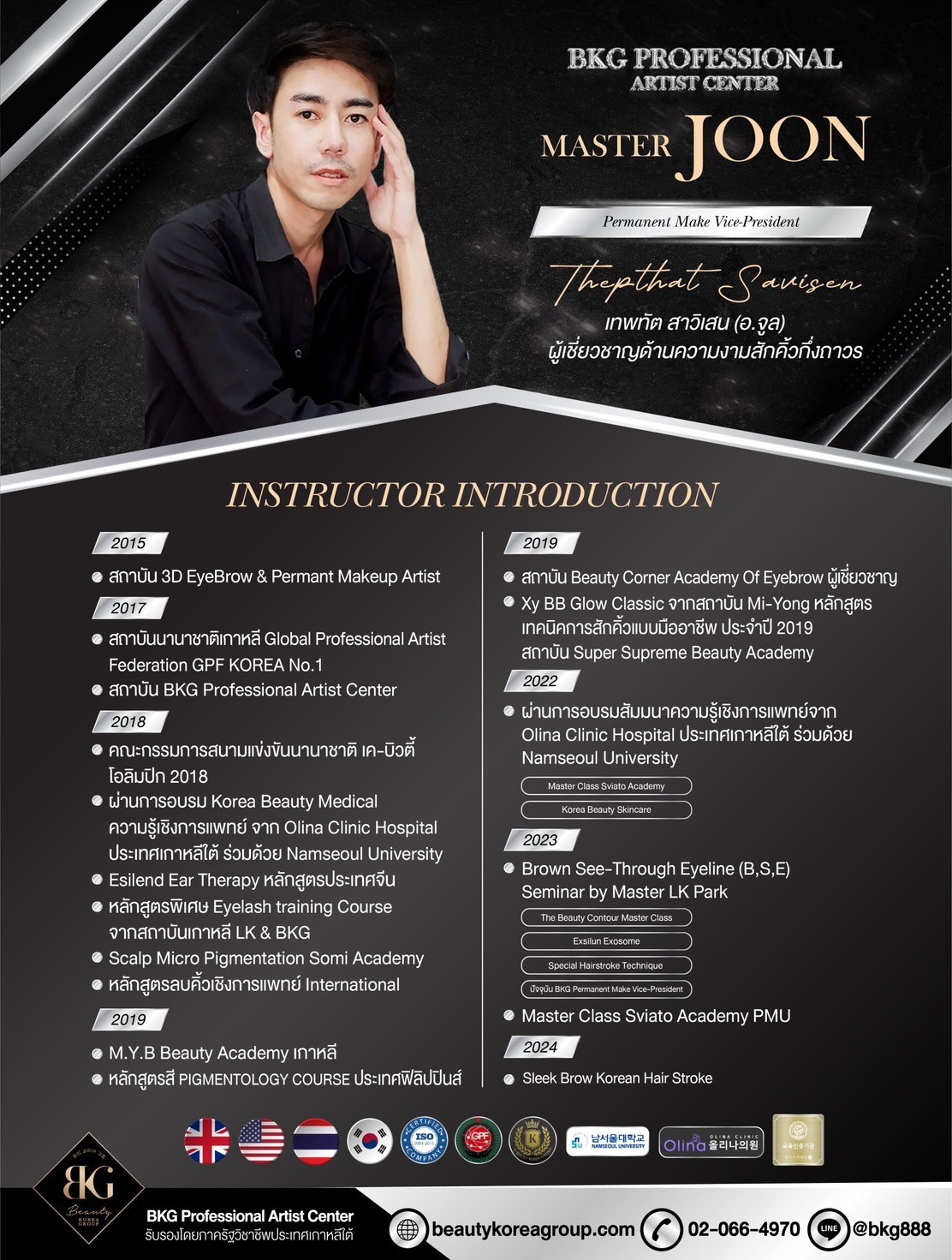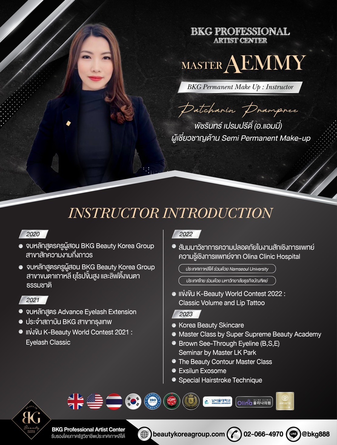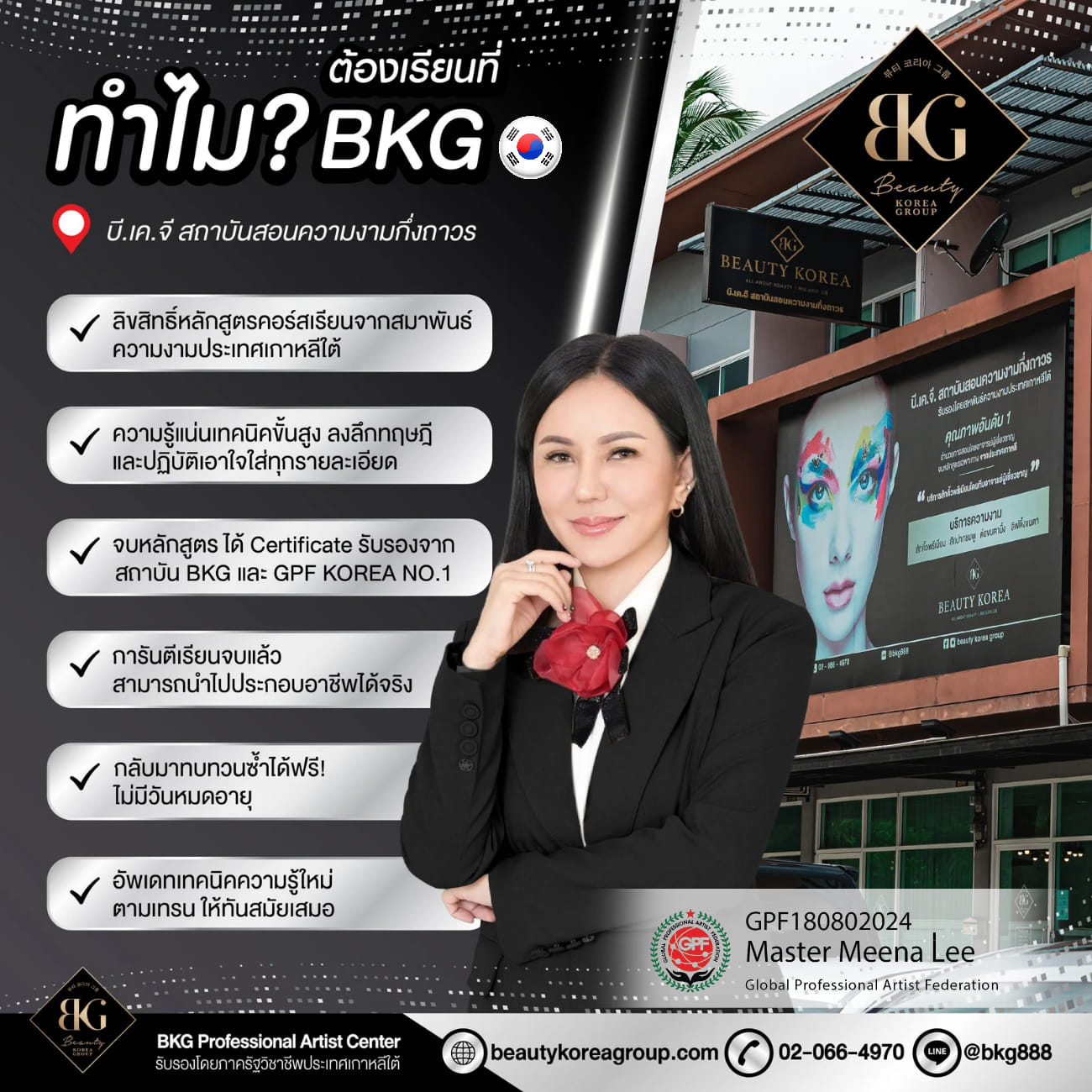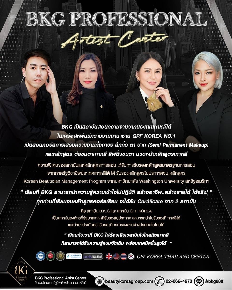 เป็นสถาบัน สอนความงามจากประเทศเกาหลีใต้ในเครือสหพันธ์ความงาม นานาชาติ GPF KOREA NO.1 เปิดสอนคอร์สการเสริมความงาม กึ่งถาวรสักคิ้วตาปาก(Semi Permanent Makeup) และหลักสูตร ต่อขนตาเกาหลี ลิฟติ้งขนตา นวดหน้าหลักสูตรเกาหลี ความพิเศษ ของสถาบันและหลักสูตรการสอนได้รับการรับรองหลักสูตรมาตรฐาน การสอนจากภาครัฐวิชาชีพประเทศเกาหลีใต้ ได้รับรองหลักสูตร ใบประกาศ จบหลักสูตร Korean Beautician Management Program จากมหาวิทยาลัย Washington University สหรัฐอเมริกา และความพิเศษที่สุดที่ผู้เรียนไม่ควรมองข้ามนอกจากความรู้ความเข้าใจ และสามารถนำไปปฏิบัติสร้างอาชีพและรายได้ได้จริงทุกท่านที่เรียนจบ สำเร็จหลักสูตรคอร์สเรียนจากสถาบัน B.K.G จะได้รับใบ Certificate จาก2สถาบันคือ สถาบันB.K.G และจากสถาบันGPF KOREA สถาบันองกรณ์ ที่รัฐบาลเกาหลีรับรองใบประกาศ สามารถนำไปรับรองที่เกาหลีและนำมาประทับตรา รับรองที่กระทรวงการต่างประเทศในไทยได้ จึงเป็นประโยชน์และสามารถสร้างความ น่าเชื่อถือเป็นอย่างมากกับผู้เรียนเพราะไม่ต้องเสียเวลาบินไปเรียนไกลถึงเกาหลี ก็ได้ความรู้แน่นเทคนิคขั้นสูงและการรับรองที่สร้างความมั่นใจให้ทั้งท่านและลูกค้า ของท่านอีกด้วย " B.KG คอร์สเรียนหลักสูตรเกาหลีอันดับ1 "